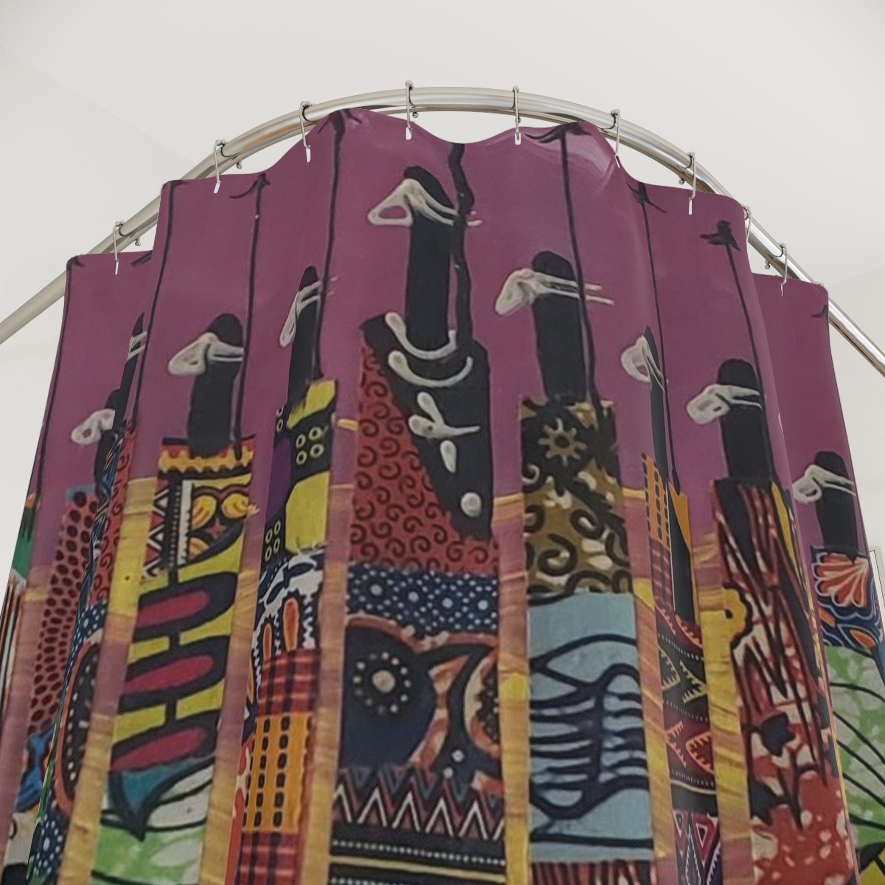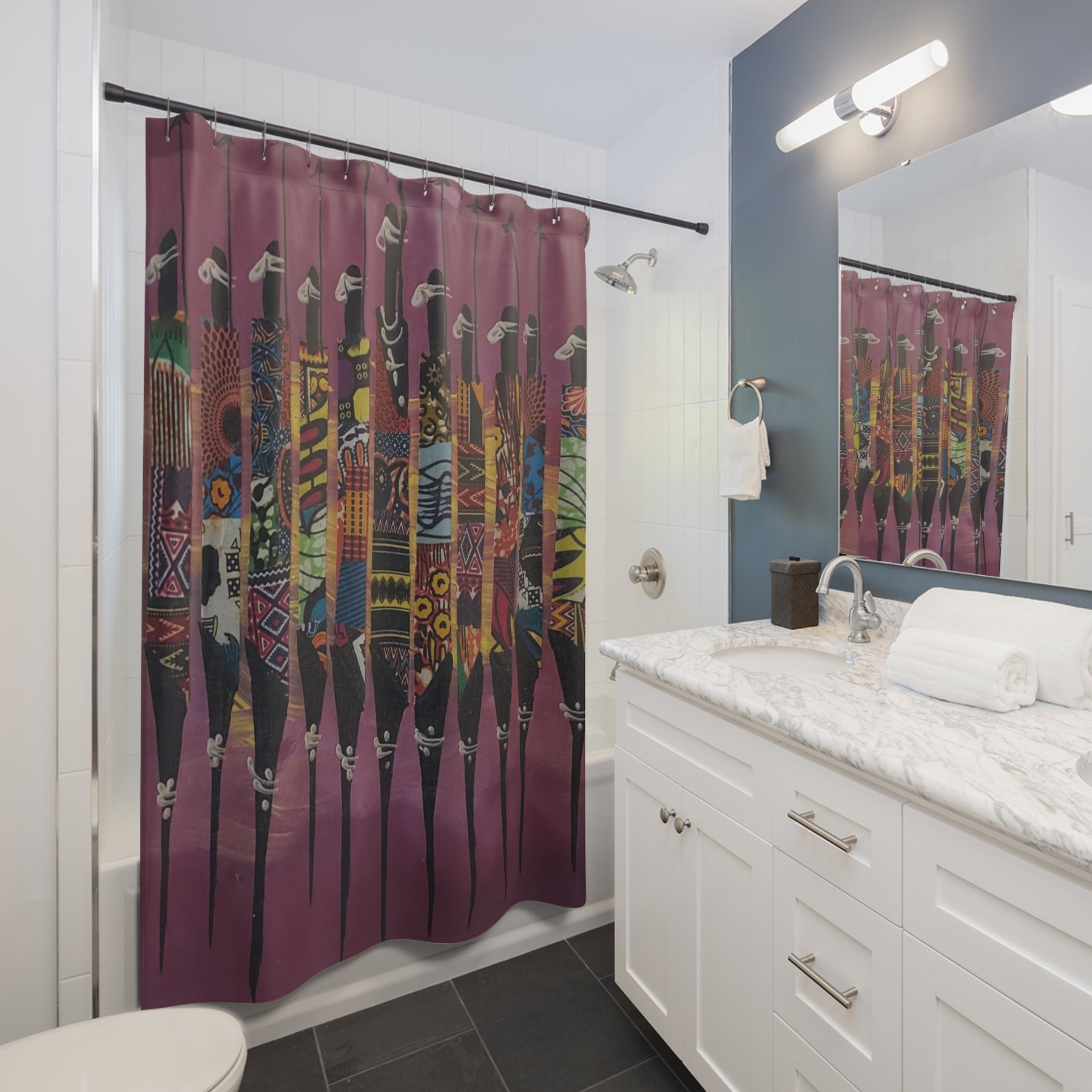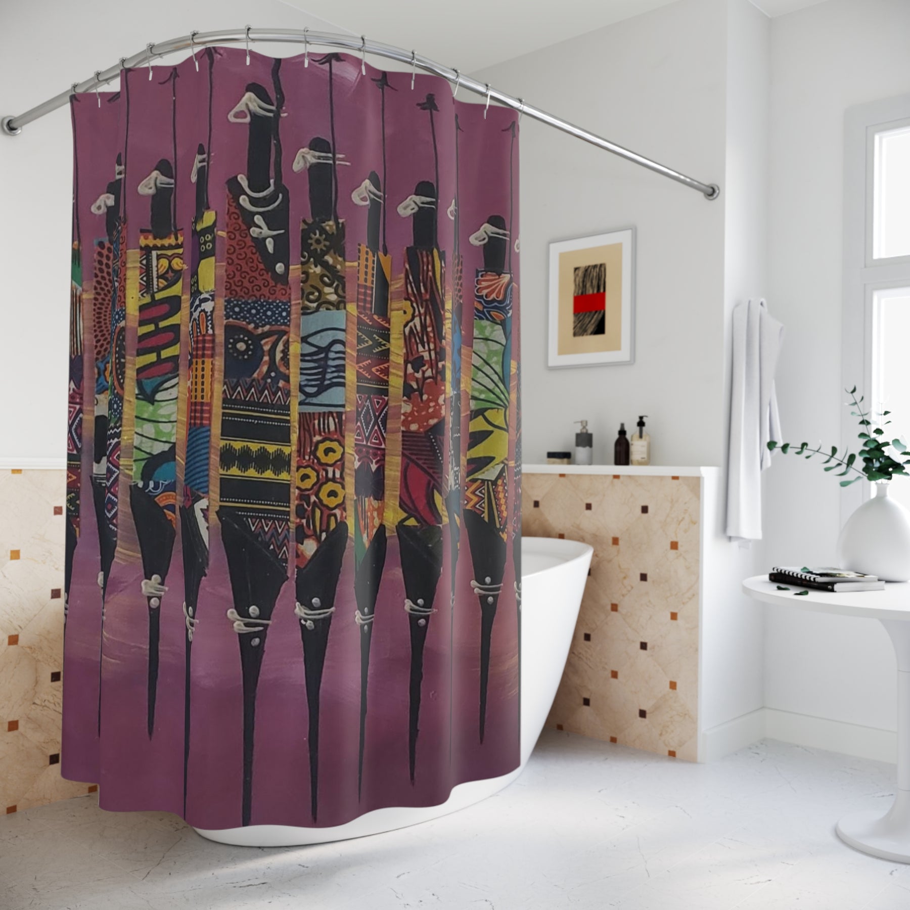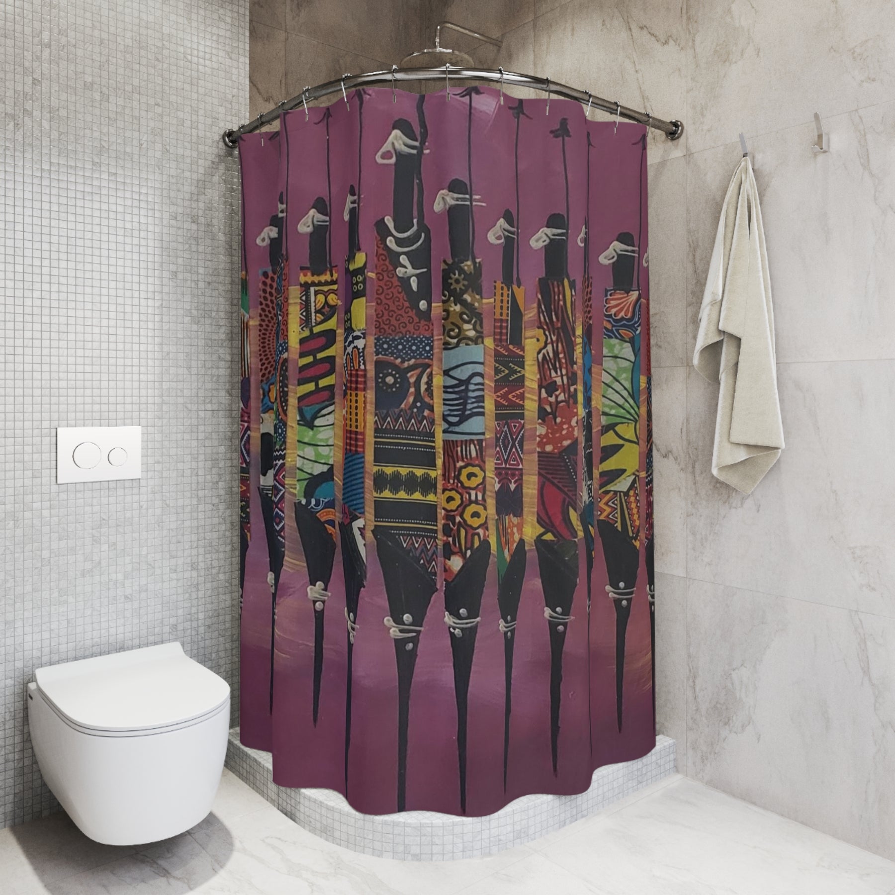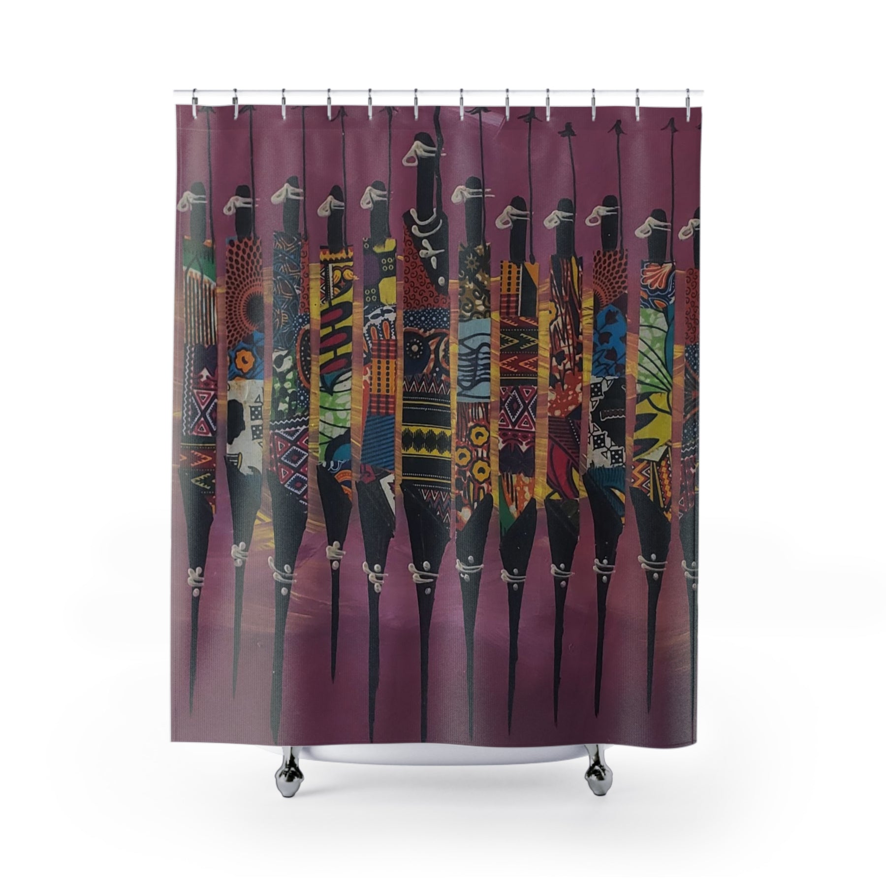 Transform your bathroom into a gallery of cultural excellence with The Warriors Shower Curtain Wall Art (Purple) — featuring tall, abstract African male figures robed in rich traditional prints. Set against a deep purple background, this bold design celebrates masculine grace, unity, and heritage through wearable art.