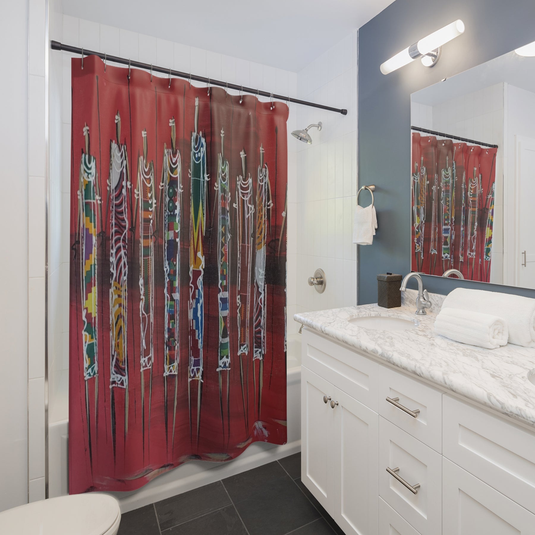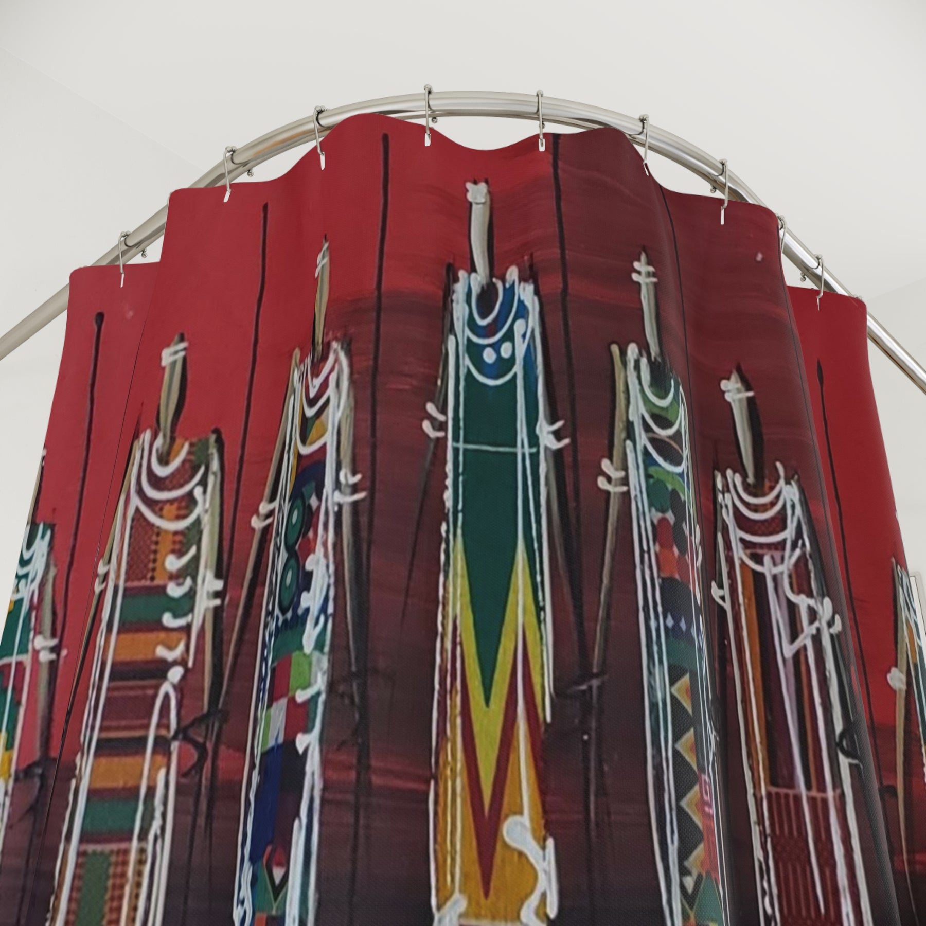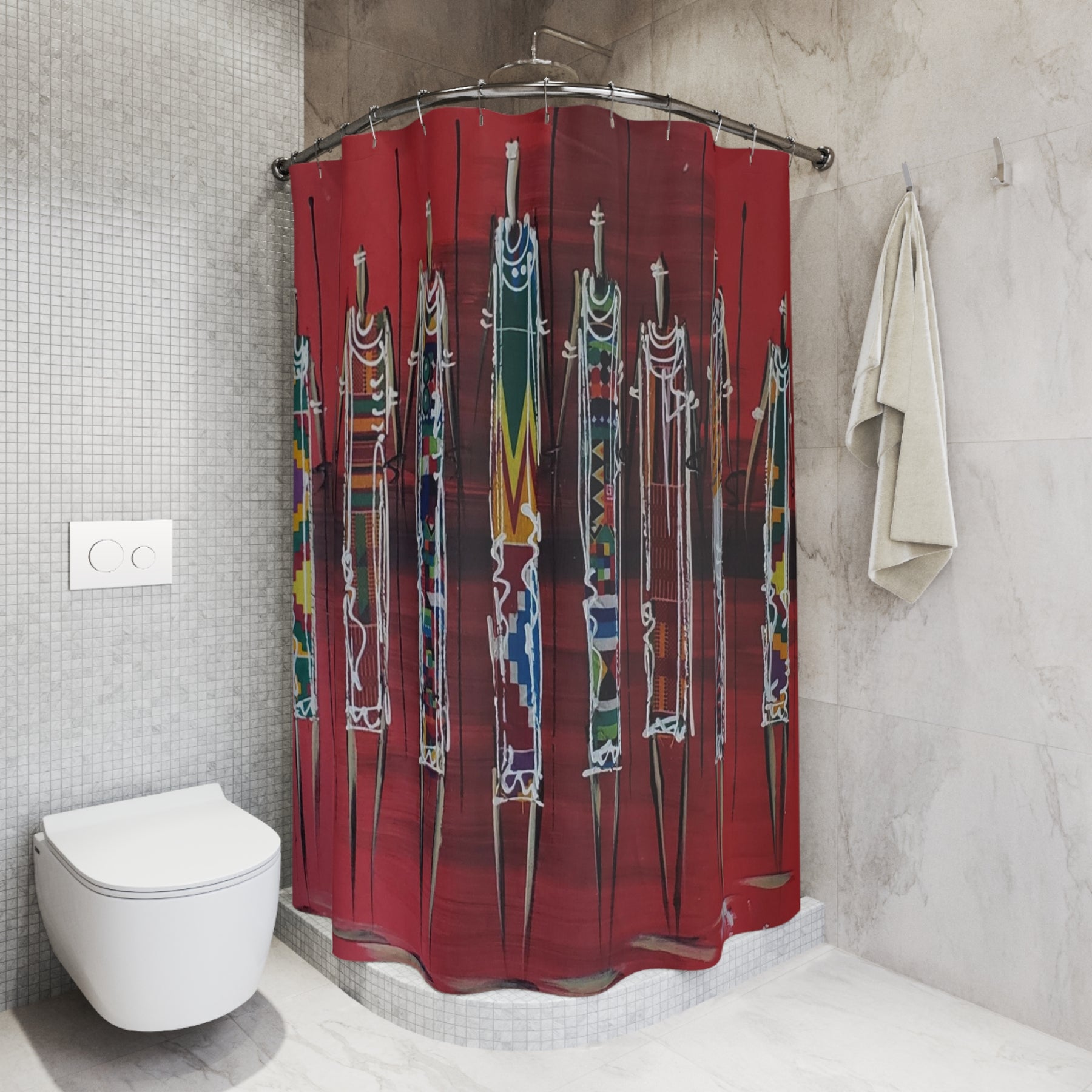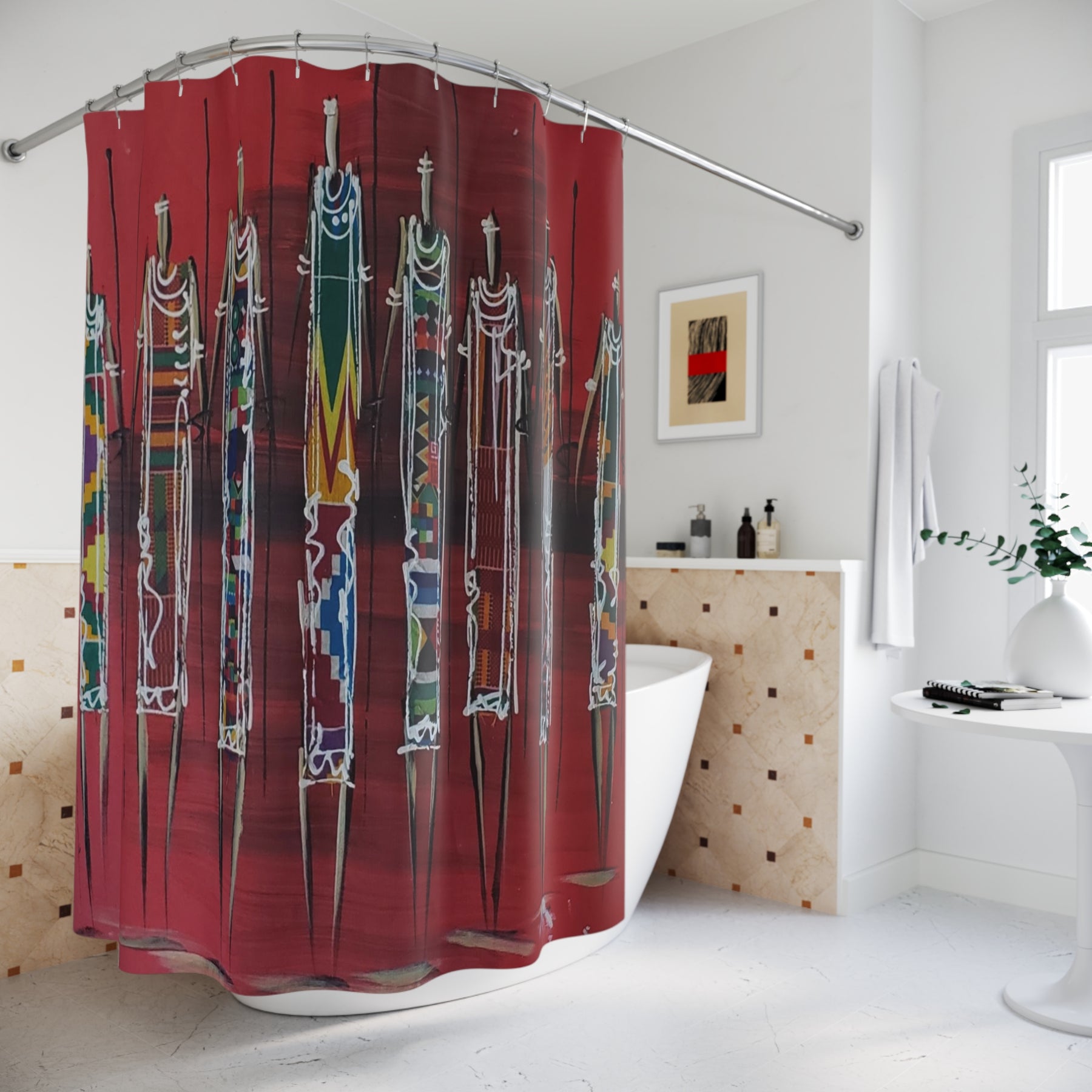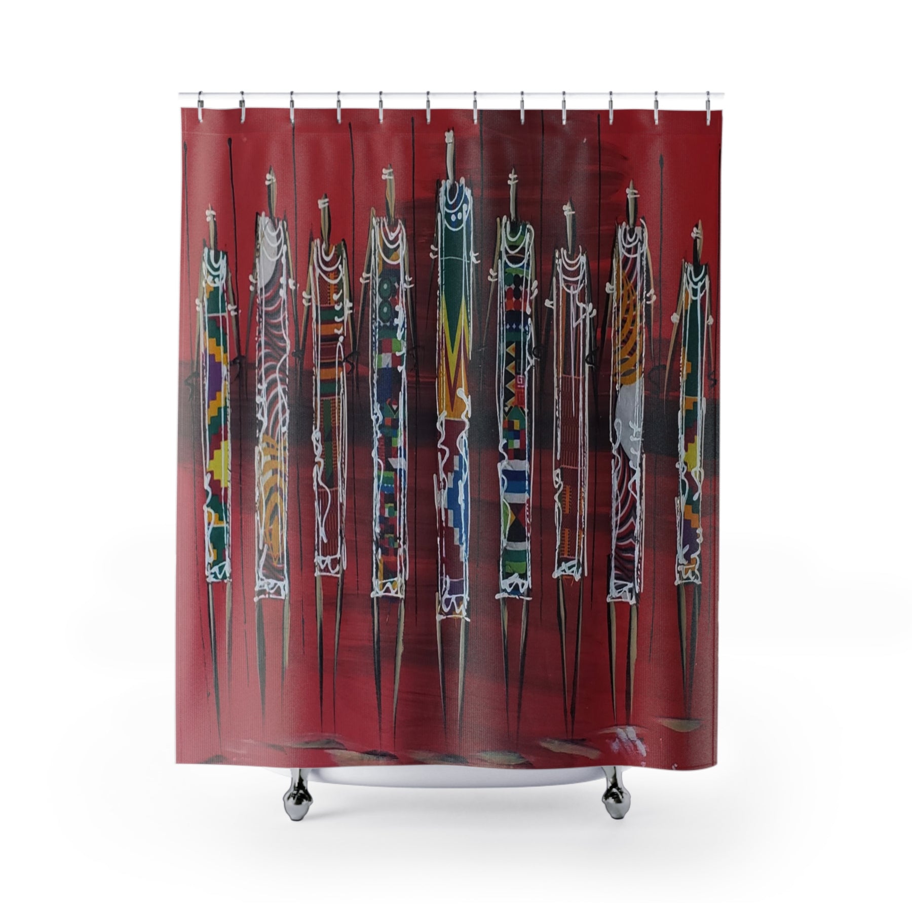 Bring ancestral pride and bold presence into your home with The Warriors Shower Curtain Wall Art (Red). Featuring a lineup of tall, abstract African male figures adorned in traditional, multicolor garments, this striking design radiates dignity, protection, and timeless unity.